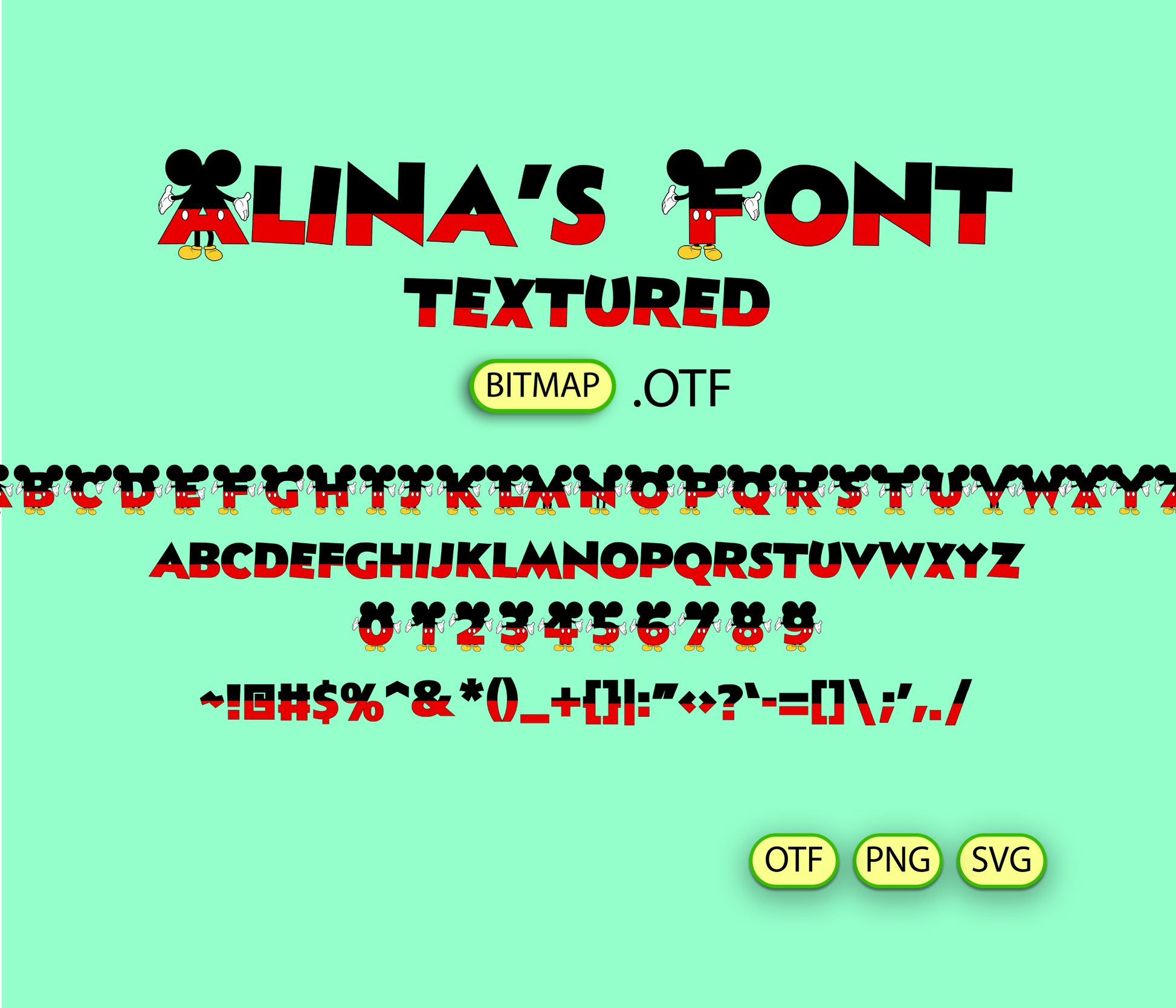 - Alina's FONT NO TEXTURE | - 1 *OTF (Open Type Font) original FONT (you can change size, color etc.) + 94 PNG + AI (adobe illustrator) + SVG