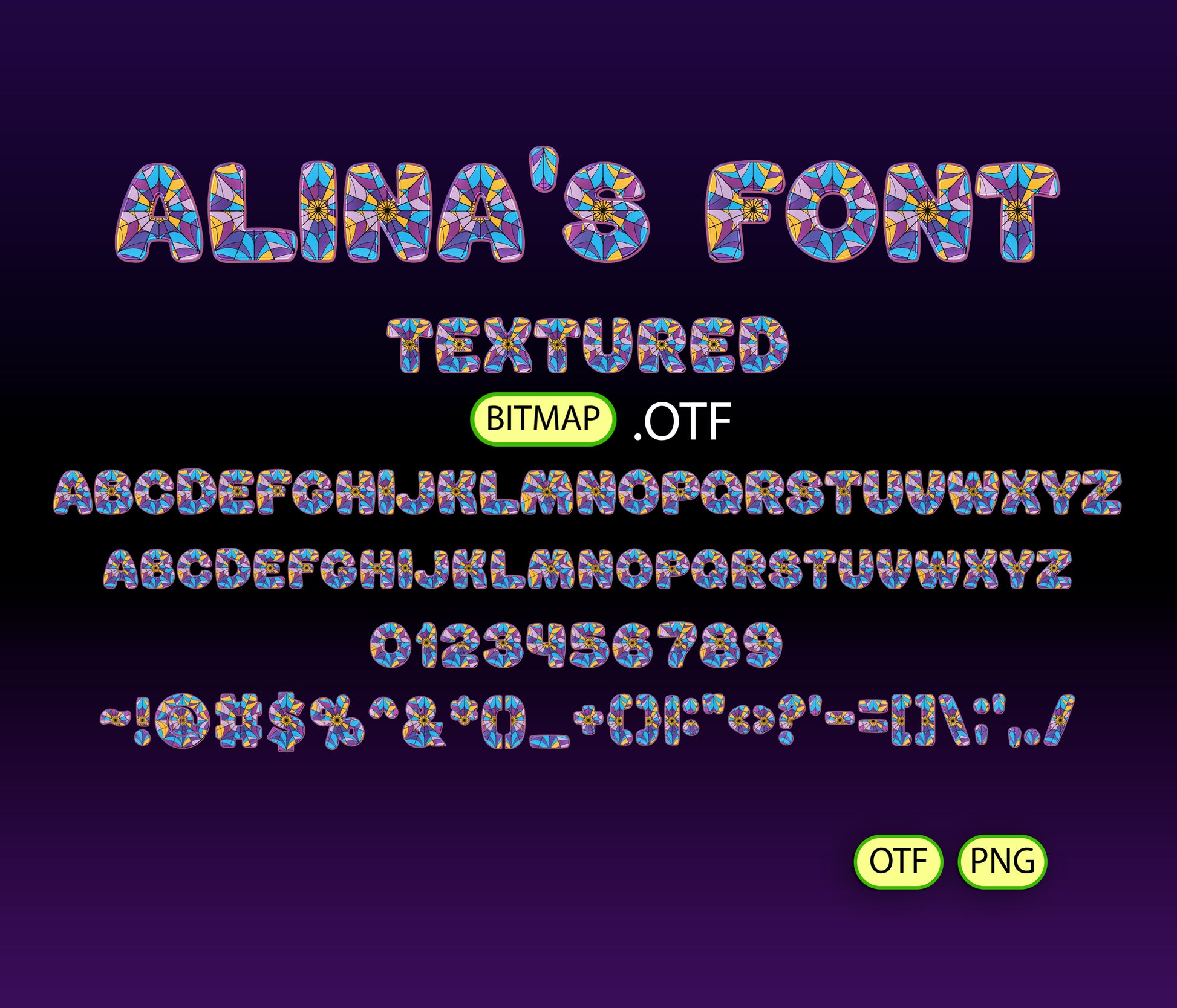 - Alina's FONT TEXTURED BITMAP | - 1 *OTF (Open Type Font) original FONT (you can change only the size) + 94 PNG *******DISCLAIMER!