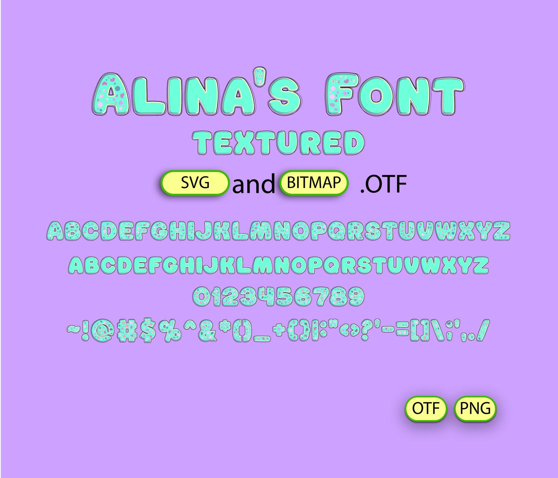 - Alina's FONT TEXTURED BITMAP + SVG | - 2 *OTF (Open Type Font) original FONT (you can change only the size) + 94 PNG *******DISCLAIMER!
