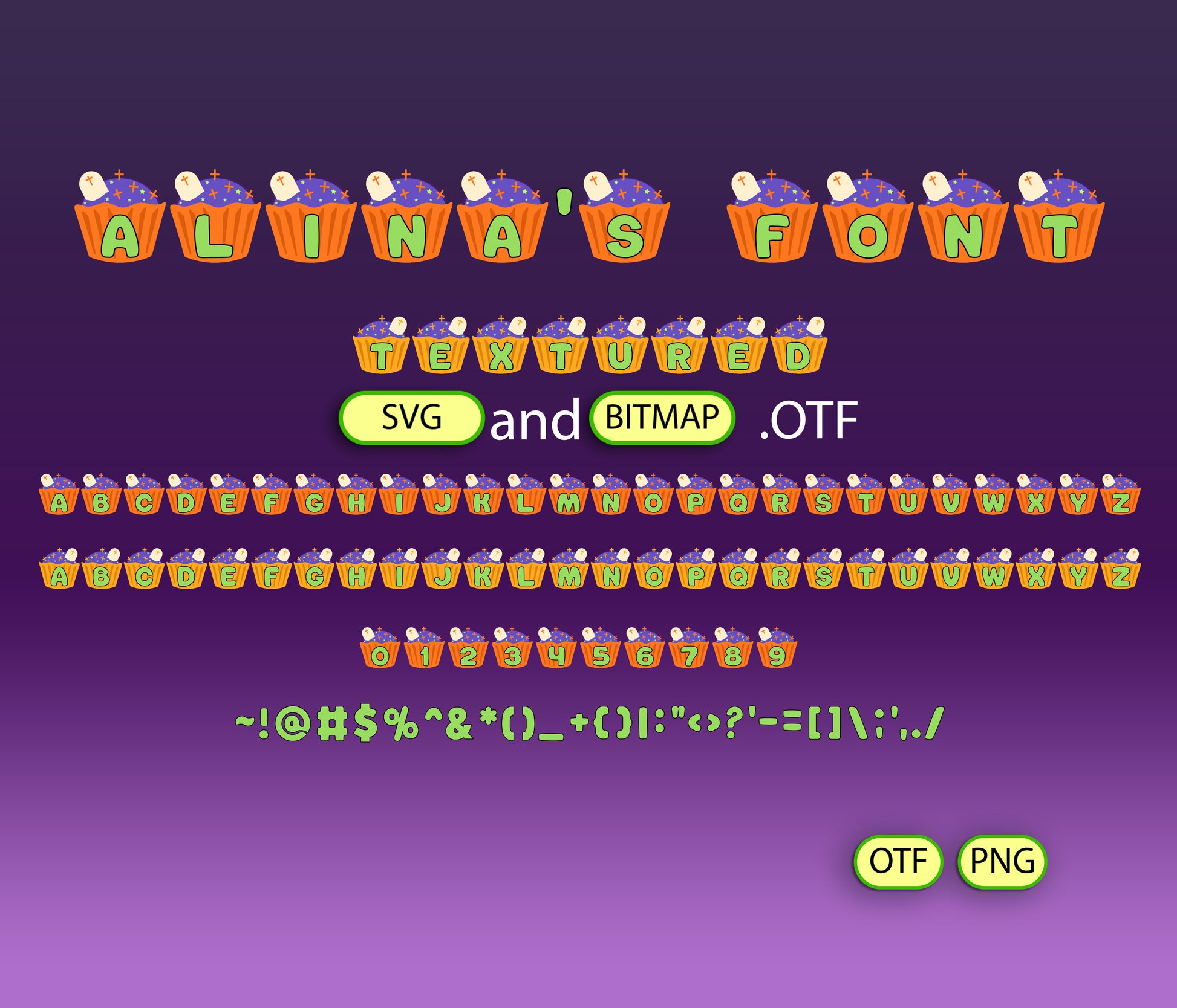 - Alina's FONT TEXTURED BITMAP + SVG | - 2 *OTF (Open Type Font) original FONT (you can change only the size) + 94 PNG *******DISCLAIMER!