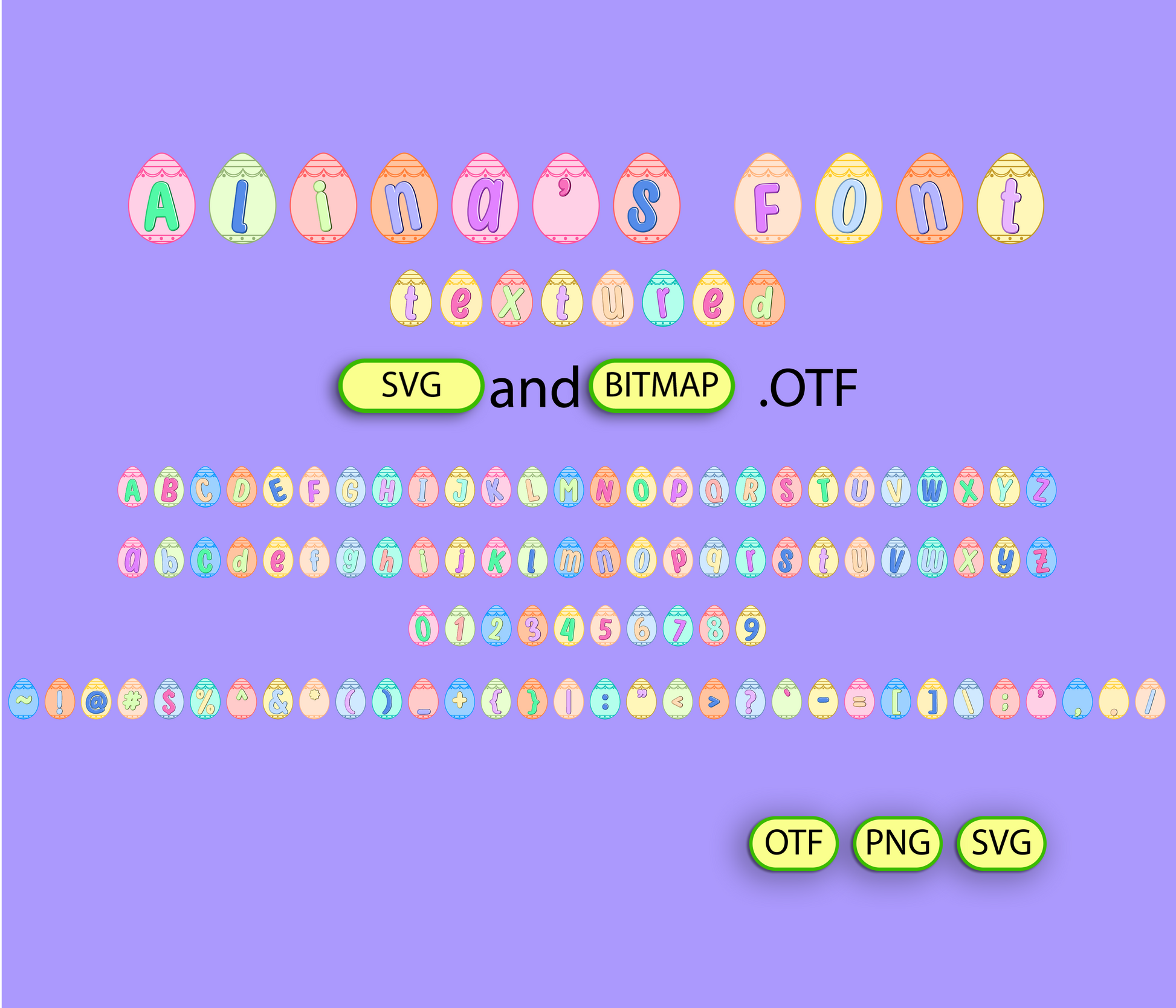 - Alina's FONT TEXTURED V1 BITMAP + SVG | - 2 *OTF (Open Type Font) original FONT (you can change only the size) +94 PNG + SVG *******DISCLAIMER!