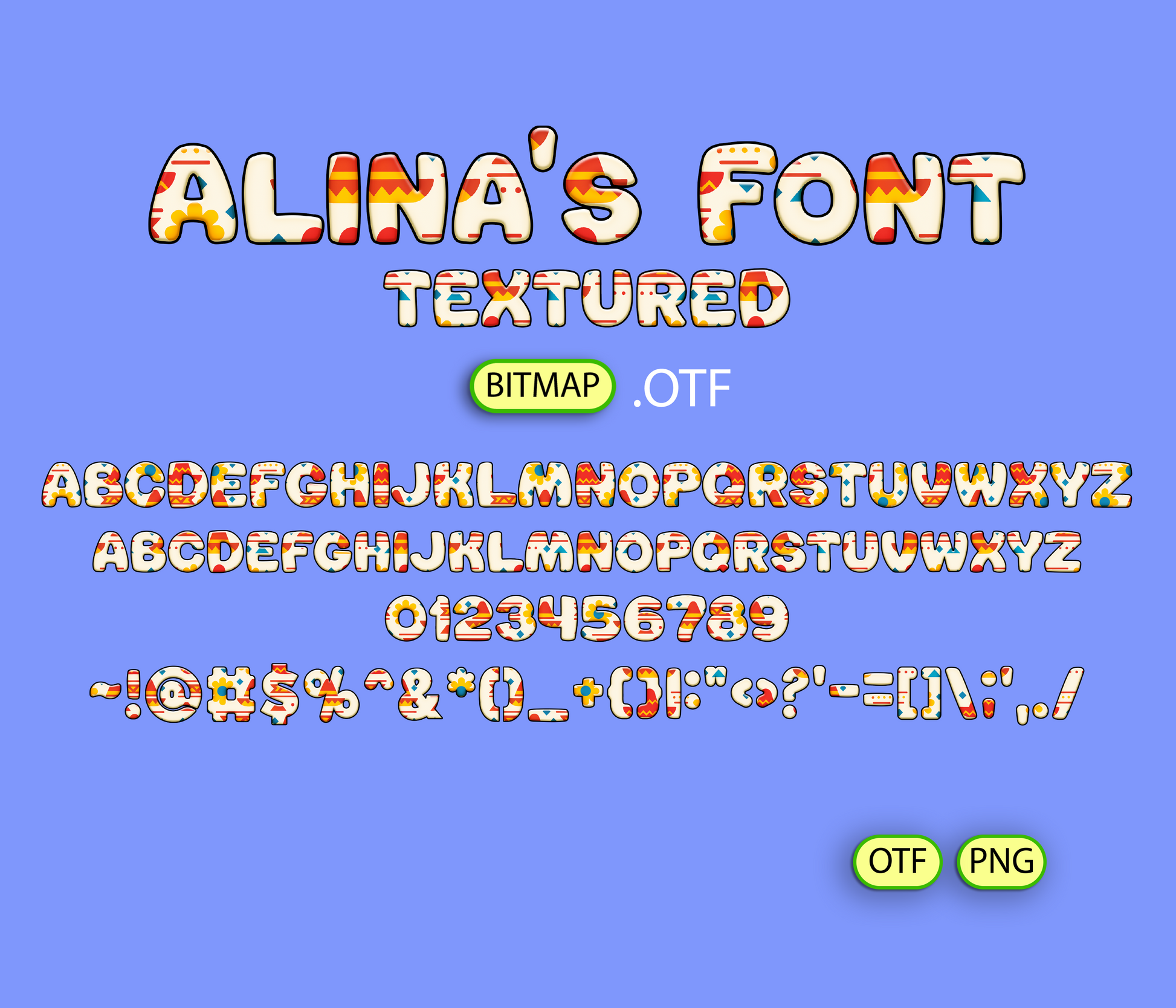 - Alina's FONT TEXTURED BITMAP | - 1 *OTF (Open Type Font) original FONT (you can change only the size) + 94 PNG *******DISCLAIMER!