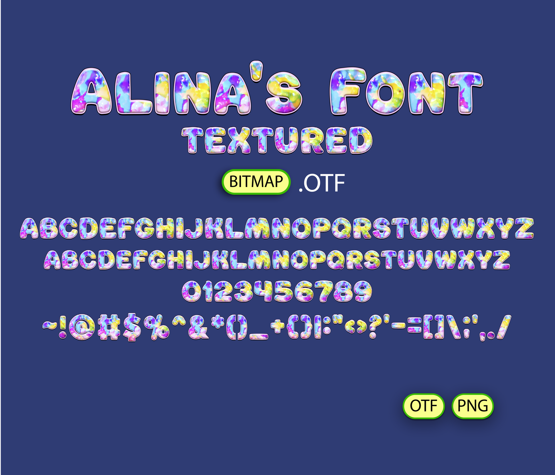 - Alina's FONT TEXTURED BITMAP | - 1 *OTF (Open Type Font) original FONT (you can change only the size) + 94 PNG *******DISCLAIMER!