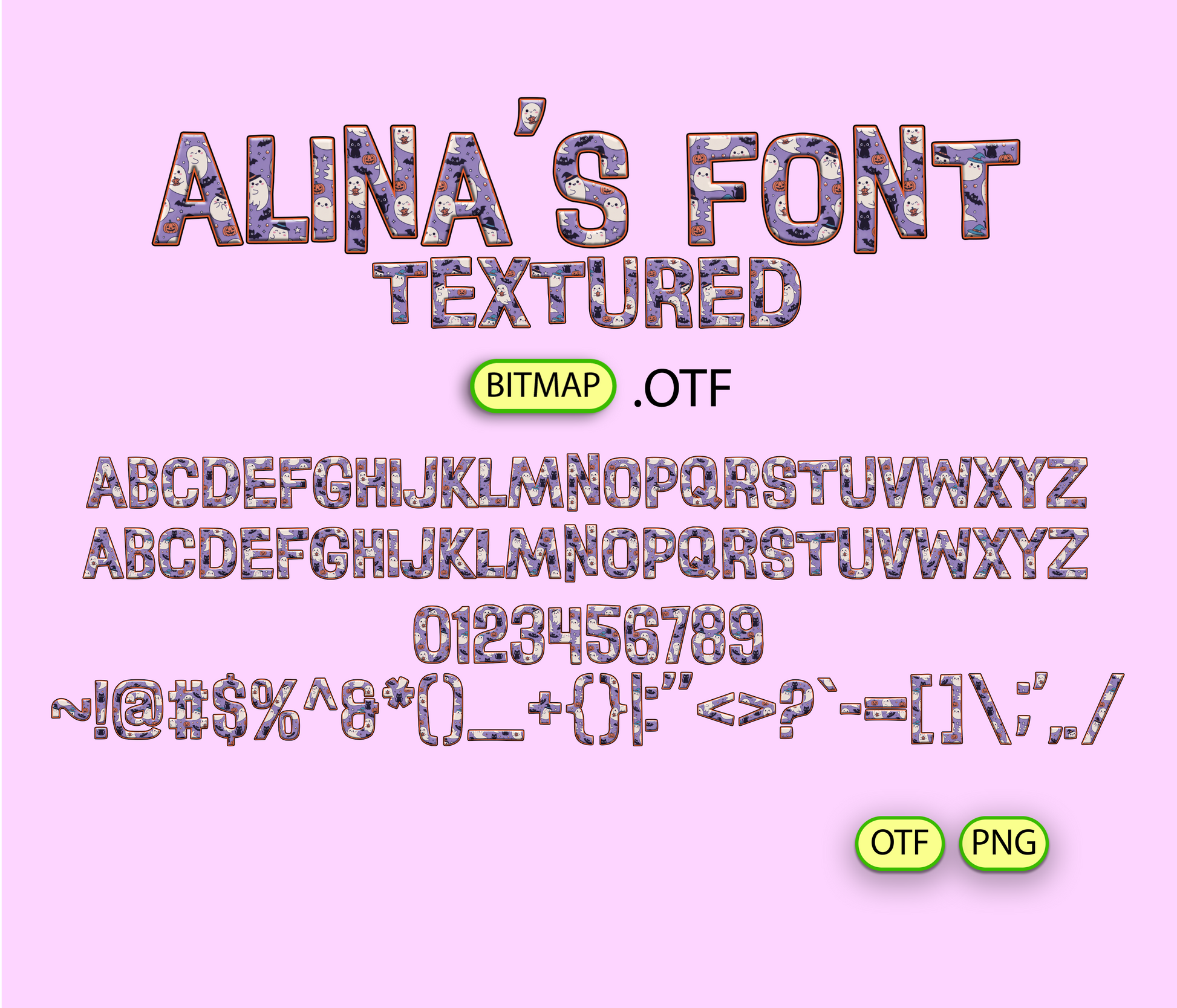 - Alina's FONT TEXTURED BITMAP | - 1 *OTF (Open Type Font) original FONT (you can change only the size) + 94 PNG *******DISCLAIMER!