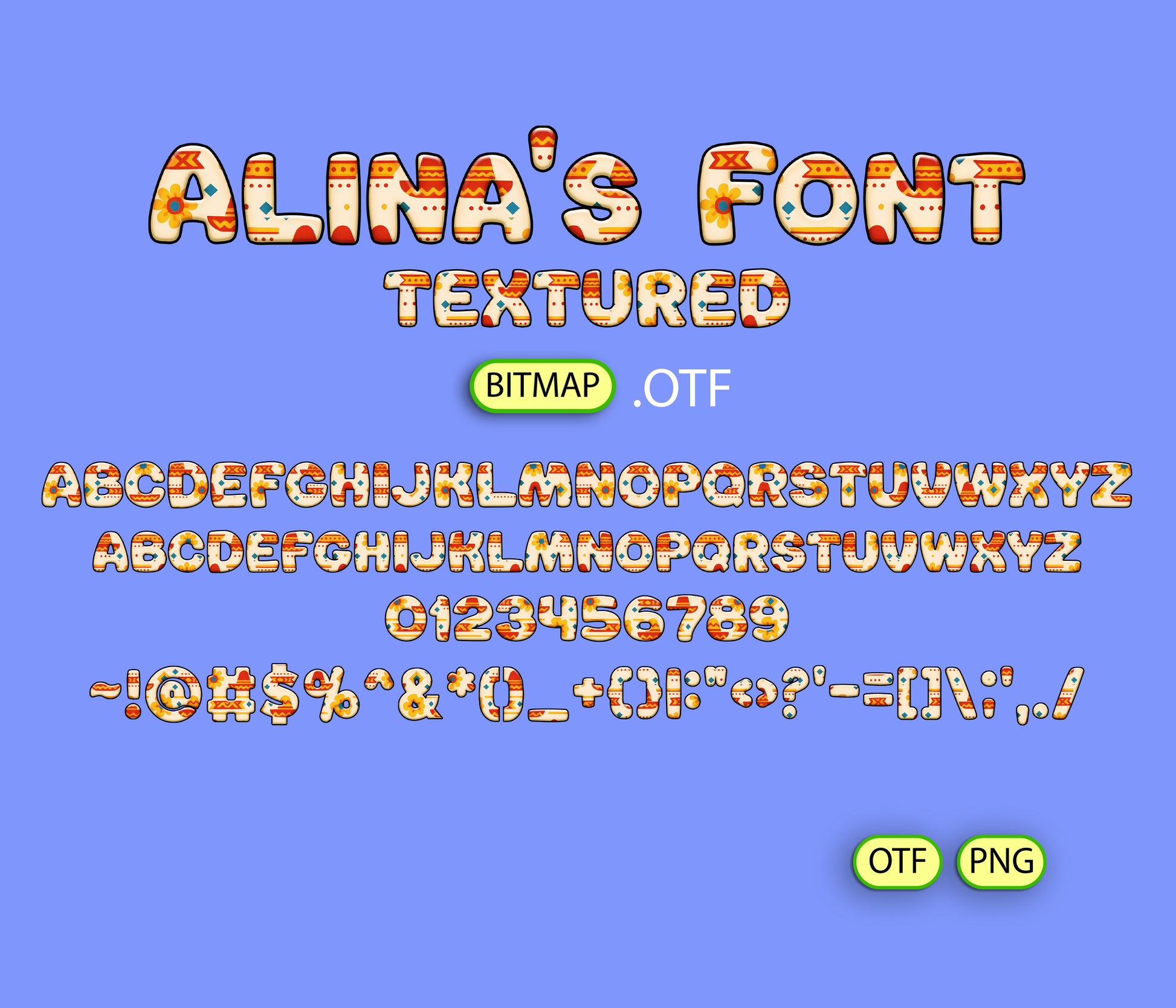 - Alina's FONT TEXTURED BITMAP | - 1 *OTF (Open Type Font) original FONT (you can change only the size) + 94 PNG *******DISCLAIMER!
