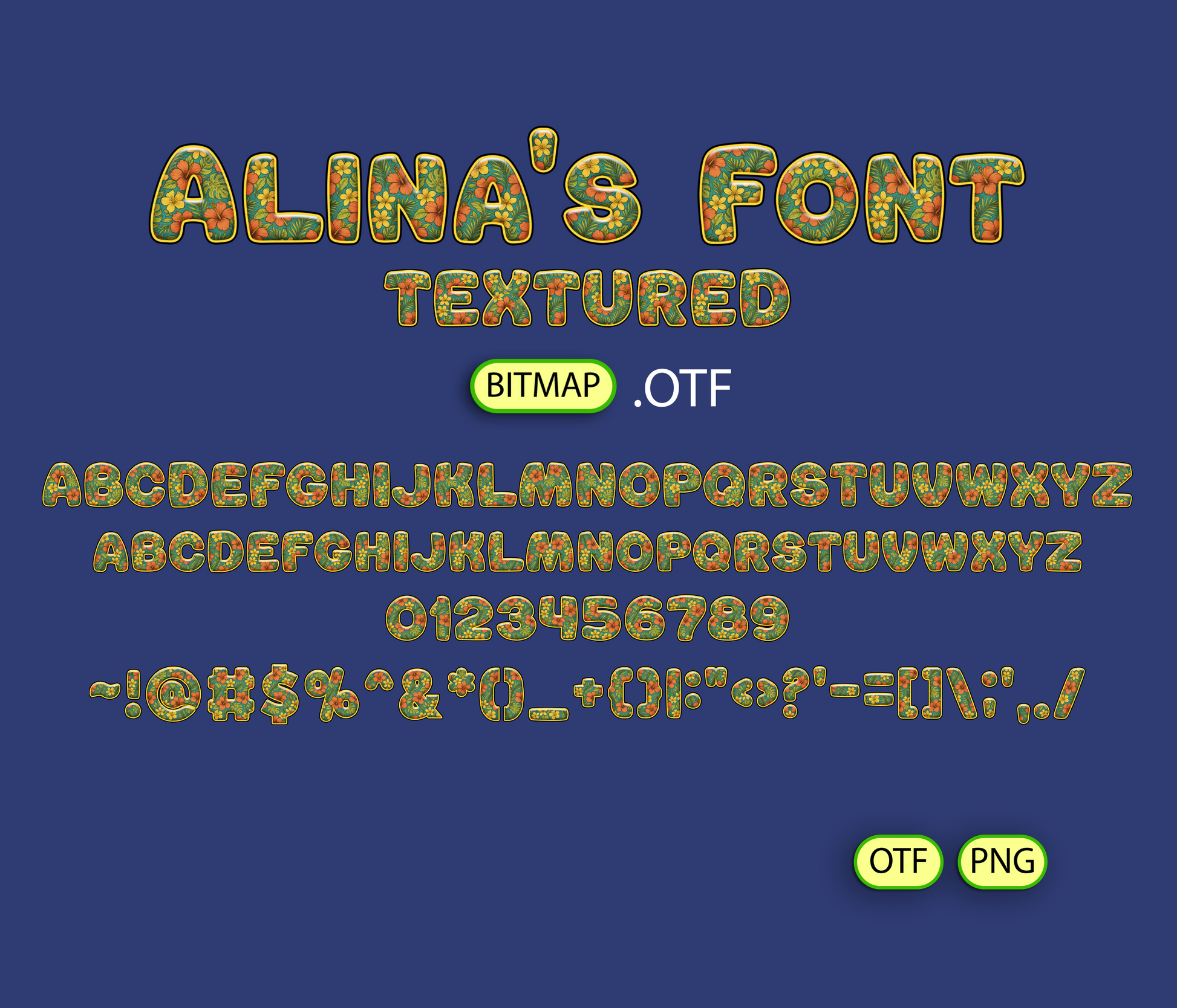 - Alina's FONT TEXTURED BITMAP | - 1 *OTF (Open Type Font) original FONT (you can change only the size) + 94 PNG *******DISCLAIMER!