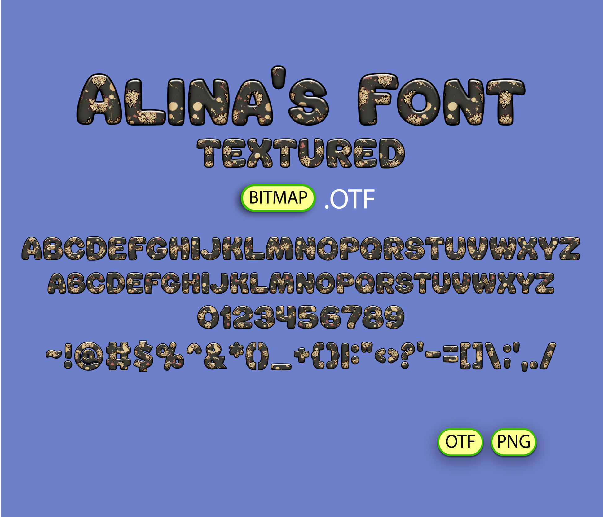 - Alina's FONT TEXTURED BITMAP | - 1 *OTF (Open Type Font) original FONT (you can change only the size) + 94 PNG *******DISCLAIMER!