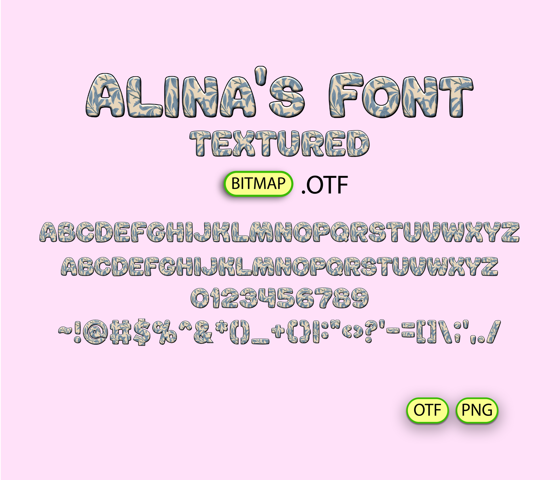- Alina's FONT TEXTURED BITMAP | - 1 *OTF (Open Type Font) original FONT (you can change only the size) +94 PNG *******DISCLAIMER!