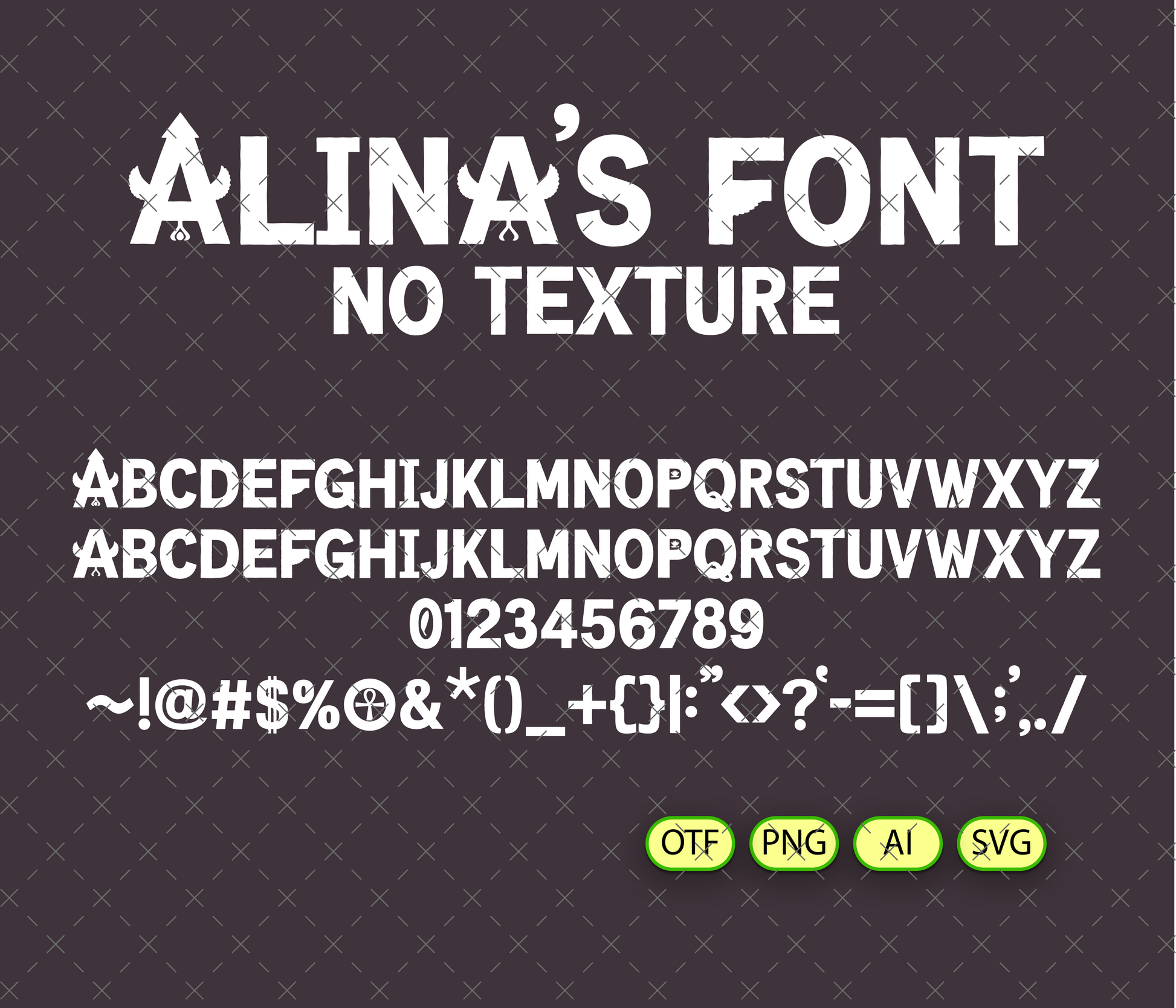 - Alina's FONT FREE NO TEXTURE v1 | - 1 *OTF (Open Type Font) original FONT (you can change size, color etc.) + 94 PNG + AI (Adobe Illustrator) + SVG