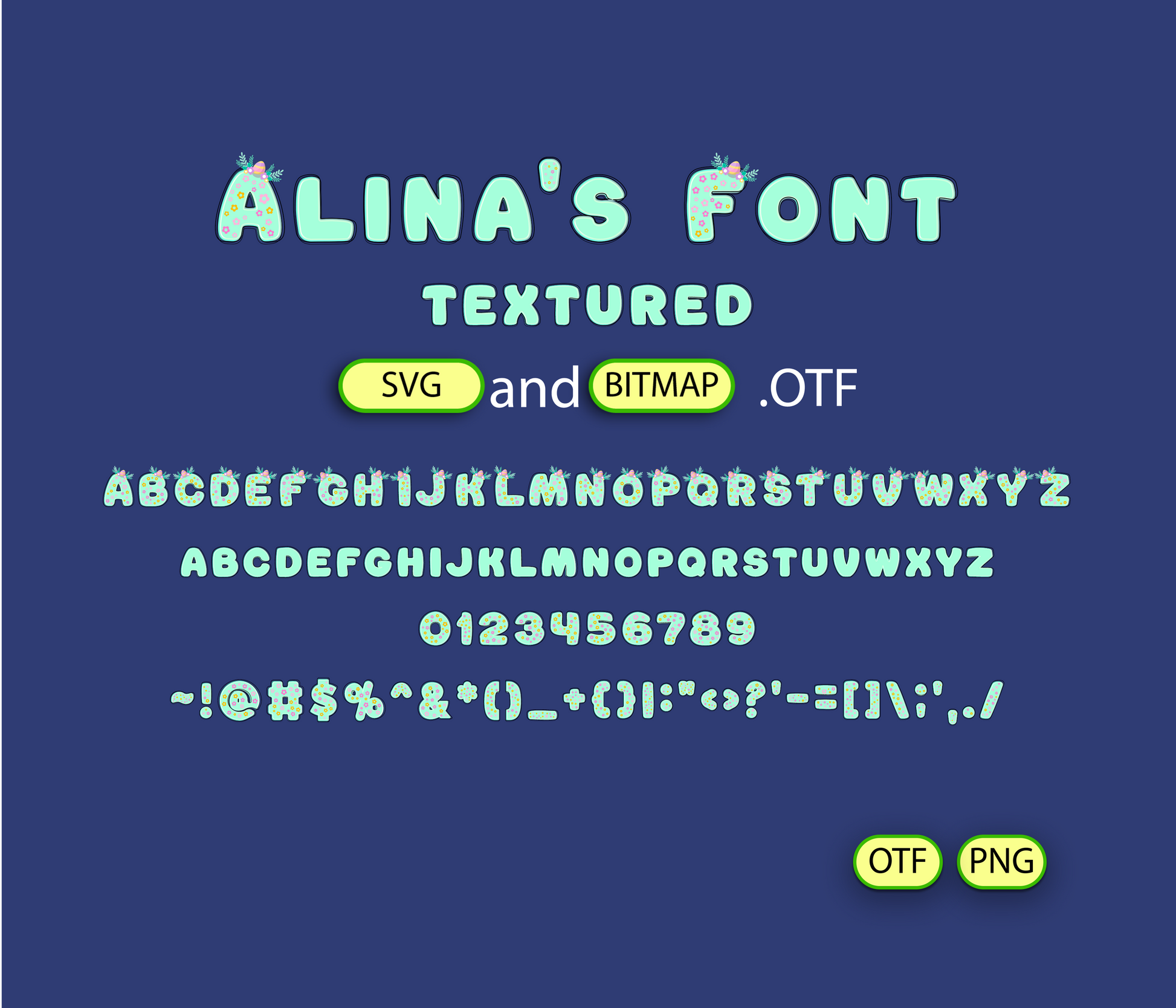 - Alina's FONT TEXTURED BITMAP + SVG | - 2 *OTF (Open Type Font) original FONT (you can change only the size) + 94 PNG *******DISCLAIMER!