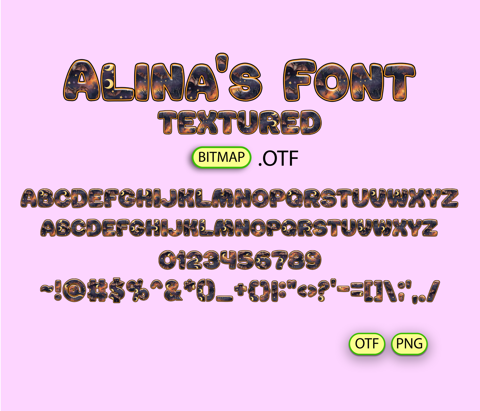 - Alina's FONT TEXTURED BITMAP | - 1 *OTF (Open Type Font) original FONT (you can change only the size) + 94 PNG *******DISCLAIMER!