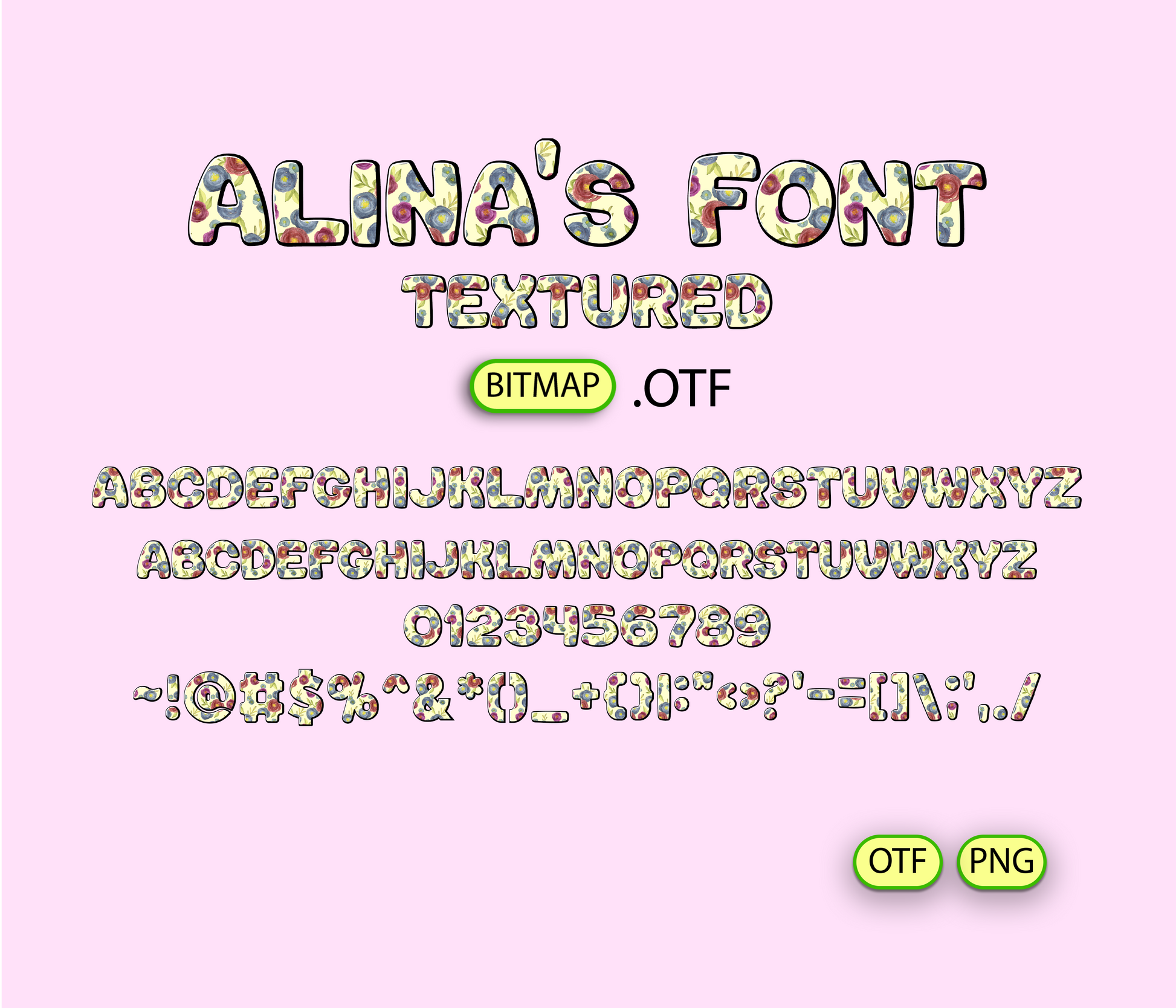- Alina's FONT TEXTURED BITMAP | - 1 *OTF (Open Type Font) original FONT (you can change only the size) +94 PNG *******DISCLAIMER!